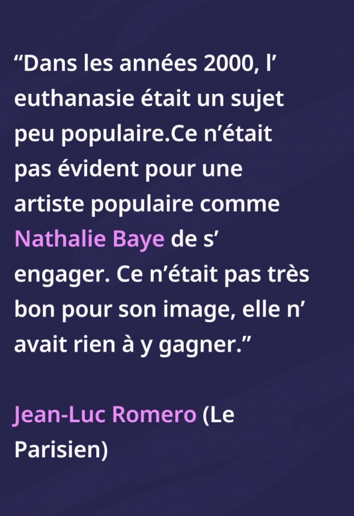 A lire dans Le Parisien : “Au début des années 2000, c’était un sujet moins populaire qu’aujourd’hui (dans différents sondages depuis 2024, plus de neuf Français sur dix se déclarent désormais favorables à l’euthanasie). Ce n’était pas si évident pour une artiste populaire de s’engager sur un sujet comme celui-là. Ce n’était pas nécessairement très bon pour son image, elle n’avait rien à y gagner.”, avait expliqué l’ancien président de l’ADMD et homme politique Jean-Luc Romero. Mais Nathalie Baye a toujours assumé cette prise de position.